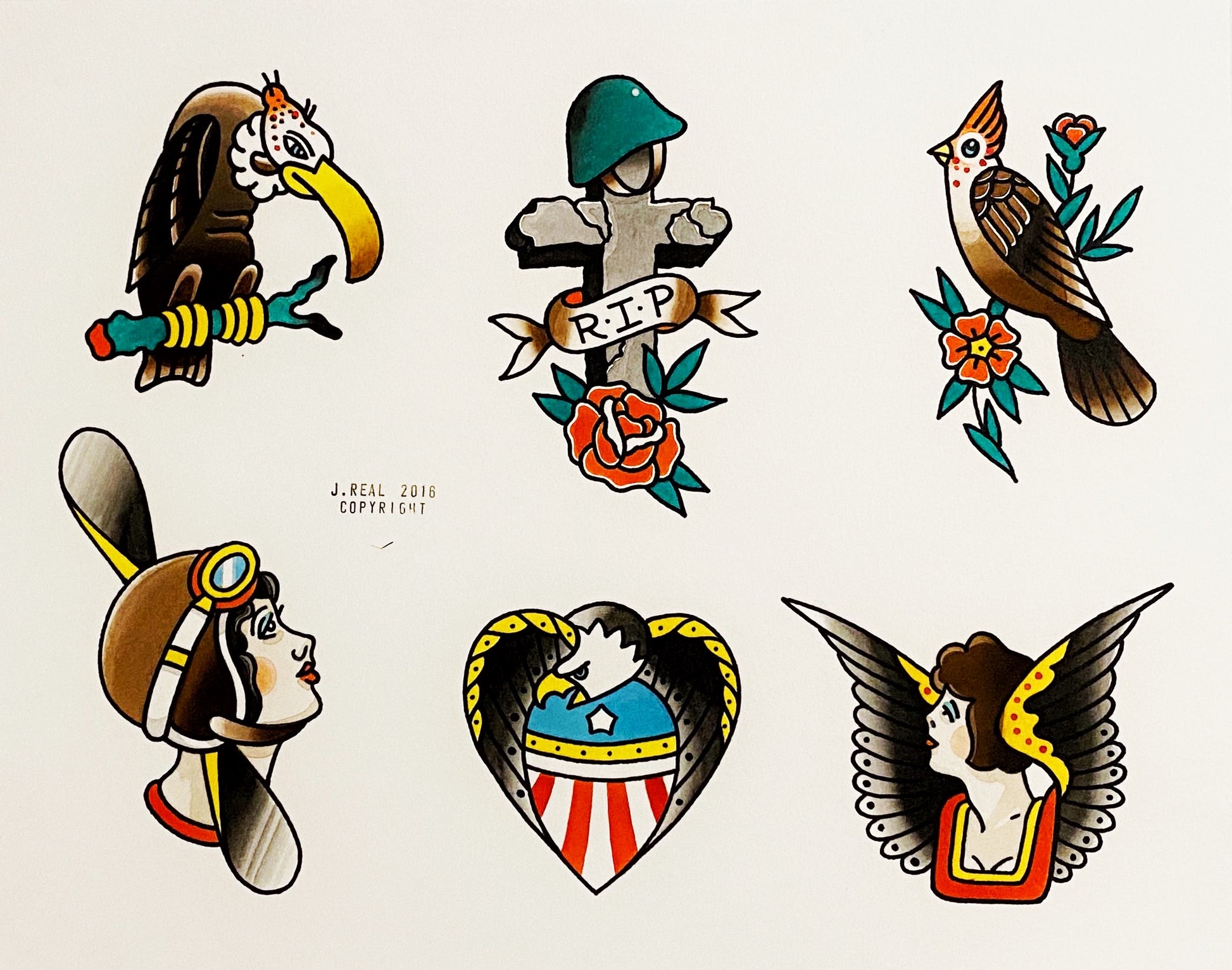 The designs contained on this flash sheet are derived from classic tattoo designs that are now ubiquitous in the tattoo world. This sheet was used in my tattoo shop, American Beauty Tattoo. These designs were tattooed on many clients over the years as this hung on the wall in my business. I'm honored to have been able to make these designs into tattoos.