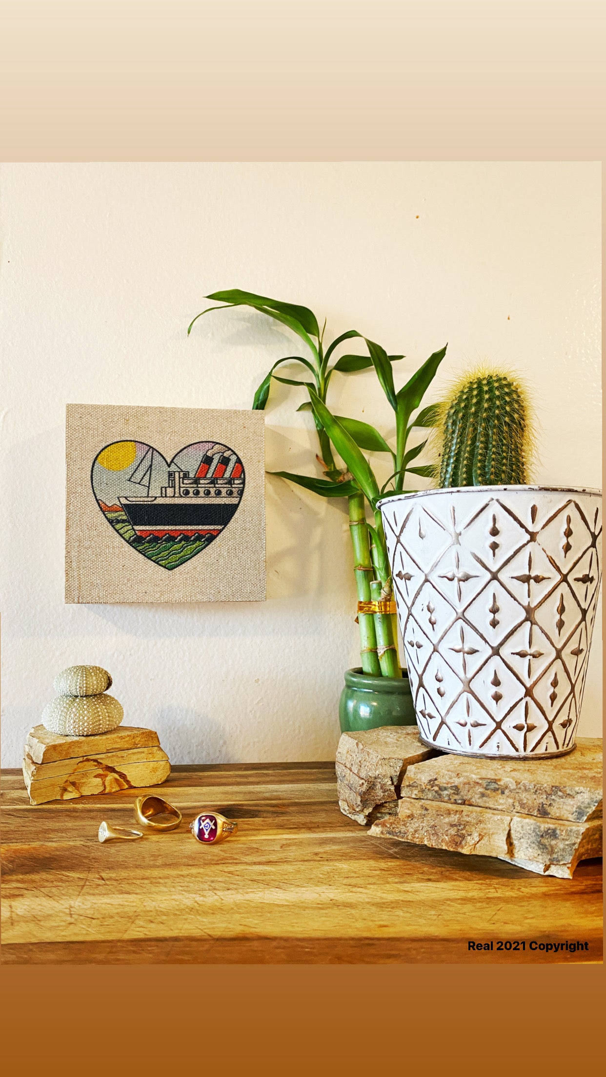Long Beach Queen Mary Heart, an original design by James Real. The design is printed on quality burlap using Direct To Garment printing using a local mall business shop, then the print is mounted, by hand, to a high quality fine art wooden panel, and completely protected with acrylic medium and a top coat of UV protectant varnish.