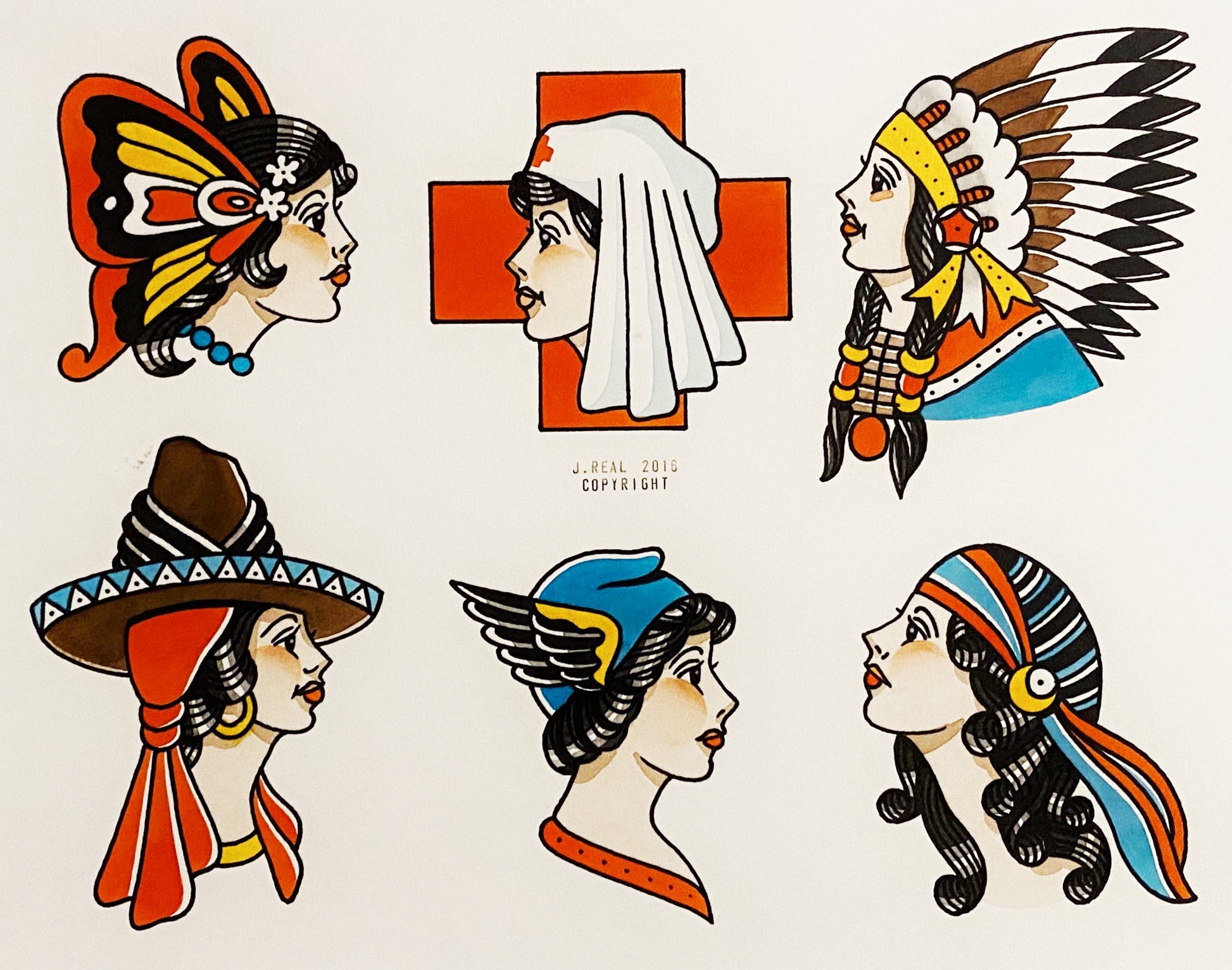 These ladies are derived from classic tattoo designs that are now ubiquitous in the tattoo world. This sheet was used in my tattoo shop, American Beauty Tattoo. These designs were tattooed on many clients over the years as this hung on the wall in my business. I'm honored to have been able to make these designs into tattoos.