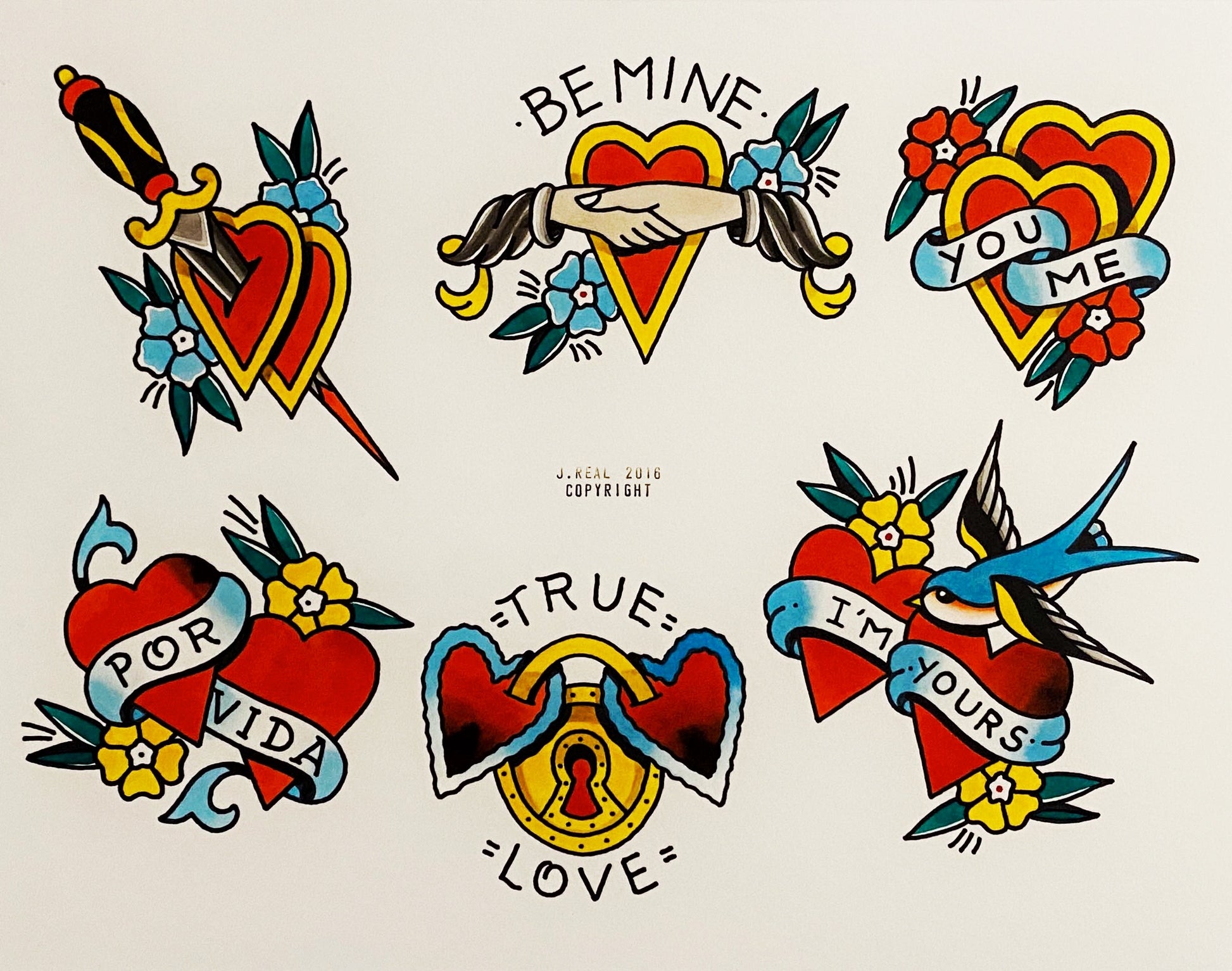 The designs contained on this flash sheet are derived from classic tattoo designs that are now ubiquitous in the tattoo world. This sheet was used in my tattoo shop, American Beauty Tattoo. These designs were tattooed on many clients over the years as this hung on the wall in my business. I'm honored to have been able to make these designs into tattoos.