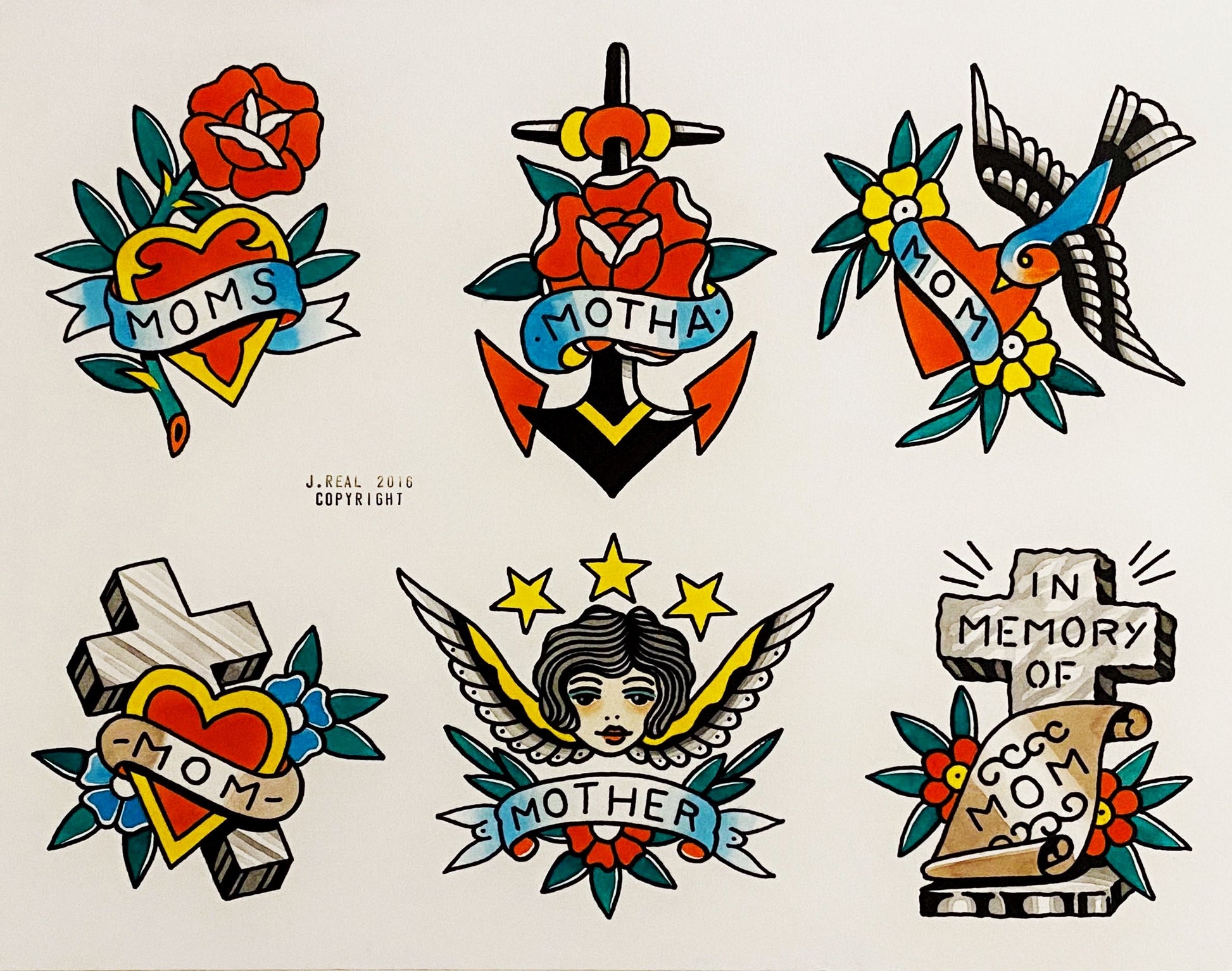 The designs contained on this flash sheet are derived from classic tattoo designs that are now ubiquitous in the tattoo world. This sheet was used in my tattoo shop, American Beauty Tattoo. These designs were tattooed on many clients over the years as this hung on the wall in my business. I'm honored to have been able to make these designs into tattoos.