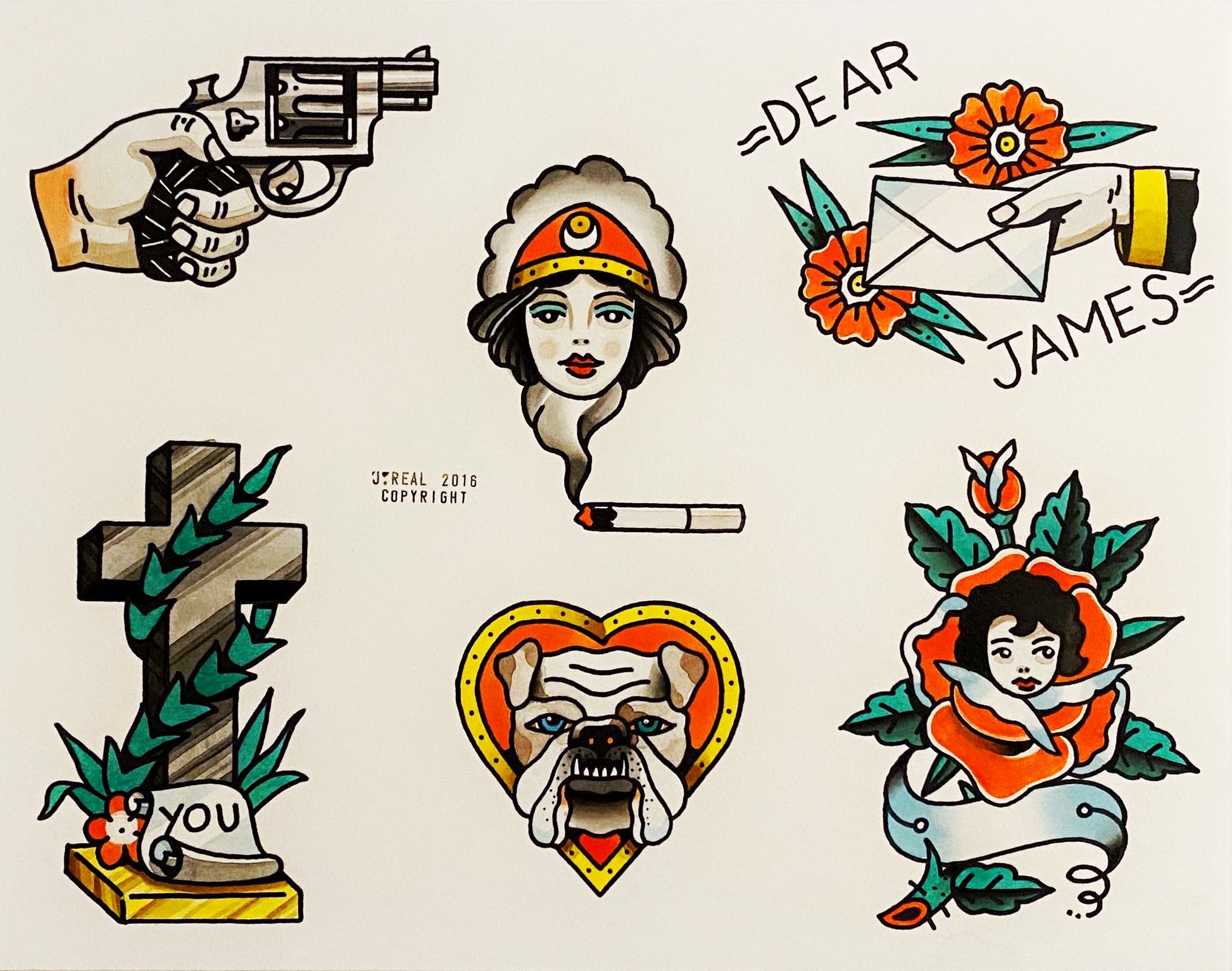 This sheet was used in my tattoo shop, American Beauty Tattoo. These designs were tattooed on many clients over the years as this hung on the wall in my business. I'm honored to have been able to make these designs into tattoos.